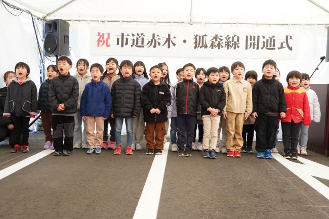 式では、高松市長が「本路線の開通により本宮地区と白沢地区間のアクセスが向上し、地域間の交流・活性化に加え、広域圏としても国道4号から三春方面へのアクセス道路として利便性を大きく向上させることができます。また、ランニングやウォーキングコースとしても親しんでいただき、周辺の散歩コースや総合運動公園などと合わせ、体を鍛えたり、心を安らげる地域になることを期待しています。」と挨拶し、たかぎ保育所5歳児の皆さんが道路の完成を祝い歌を披露しました。