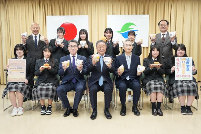 令和7年12月24日(水曜日)に、本宮高等学校の生徒10名が本宮市役所を表敬訪問し、令和7年度ふくしまの未来を創るFukurum基金を活用し開発した「かつかつヒレバーガー」「ゼロ罪バーガー」2種のオリジナルバーガーの完成を高松市長に報告しました。